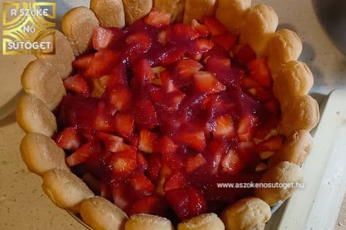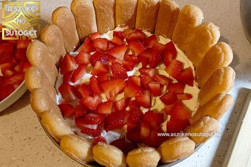 - Ezt megpakolom egy adag tejbe mártott babapiskótával. Erre most epret teszek, meglocsolom a szósszal és erre kenem a maradék krémet. Beteszem a hűtőbe egy órára.