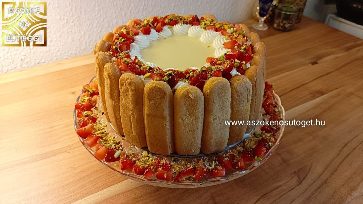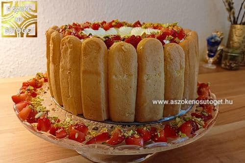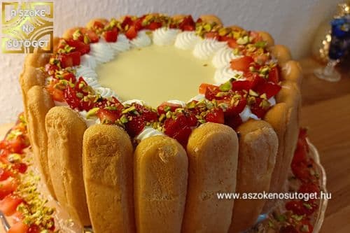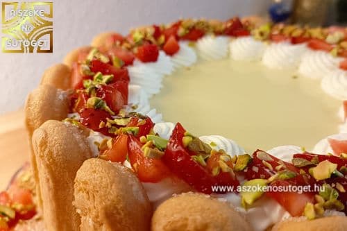 - A maradék 100 ml tejszínt pici porcukorral felverem és habzsákba töltöm. A pisztáciát összedarabolom. A tortát kiveszem a formából és tortatálra teszem. Körbedíszítem a tetejét a tejszínhabbal, megszórom eperrel és pisztáciával. Tálalásig hűtőben tartom.