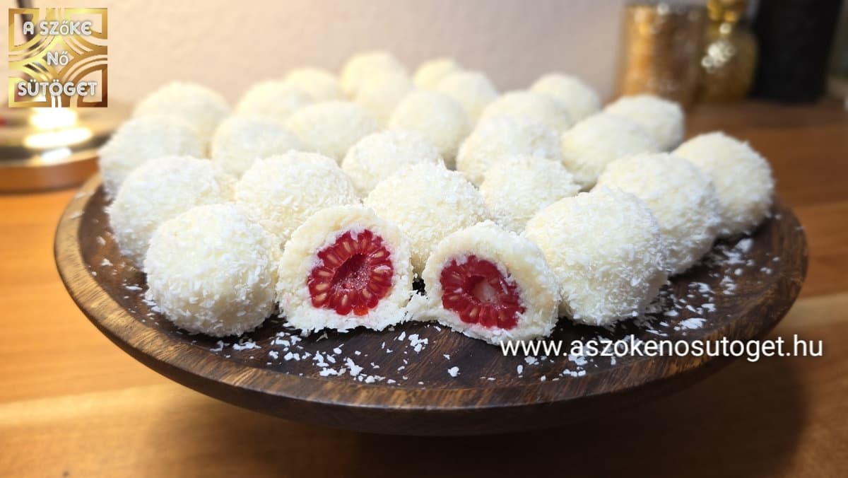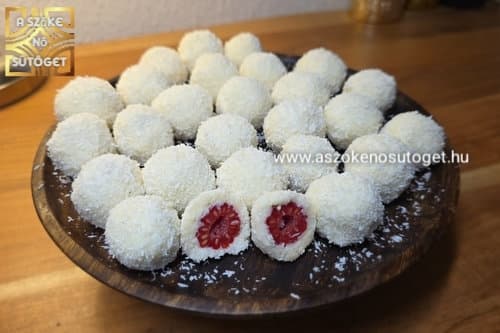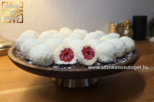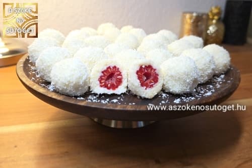 - A mascarponét kiverem a porcukorral és hozzáadom a kókuszreszeléket. Kis golyókat formálok és mindegyik közepébe rakok egy szem málnát. Kókuszreszelékbe forgatom és hűtőbe teszem tálalásig.